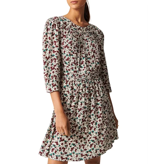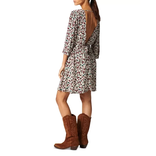 - Gathered front waist, attached back self tie belt