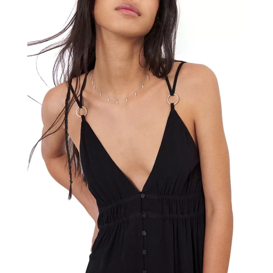 - Sleeveless, adjustable spaghetti straps crisscross at back